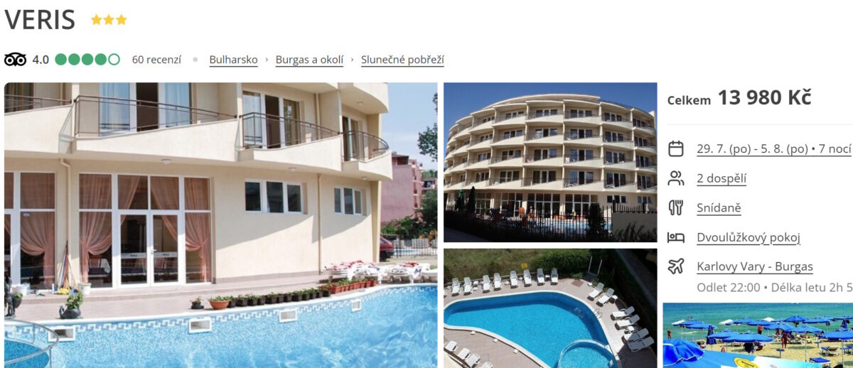 Aktuálně nejlevnější zájezd míří na bulharské pobřeží. Konkrétně jde o tříhvězdičkový hotel Veris nedaleko Burgasu.