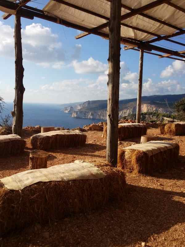 Nakonec jsme se ještě jeli podívat na vyhlídku do nedaleké vesničky jménem Keri, kde vedle malého parkoviště stojí karavan s občerstvením a před ním příjemné posezení na slaměných balících pod dřevěným přístřeškem odkud jsme si nejlépe užili výhled na bílé útesy táhnoucí se podél tmavomodrého moře. Po tomto krásném zážitku jsme se mohli vydat zpět přes Laganas a Zakynthos na večeři do našeho hotelu v Tsilivi.