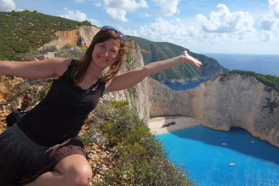 Ze severního cípu směrem dolů podél západního pobřeží směrem na Volimes jsme se pomalu přibližovali k vytoužené vyhlídce na pláž Navagio. Podle parkoviště plného aut se hned pozná, že se jedná o turistickou dominantu Zakynthosu. Sešli jsme kousek dolů ke kraji útesů, kde je jediné místo ohraničené zábradlím určené pro fotografy, avšak pro mnohé nenabízí dostačující výhled a tak turisté s fotoaparáty stejně jako my chodili po nebezpečných okrajích útesů se snahou najít ideální záběr. Zda už někdy někdo při focení spadl dolů do moře, jsme se nedozvěděli. Nakonec jsme našli ideální místečko na vybíhajícím útesu nabízející výhled a fotky jako z katalogu. Po dlouhé chvíli kochání spokojeně odjíždíme napříč ostrovem zpět do Tsilivi.