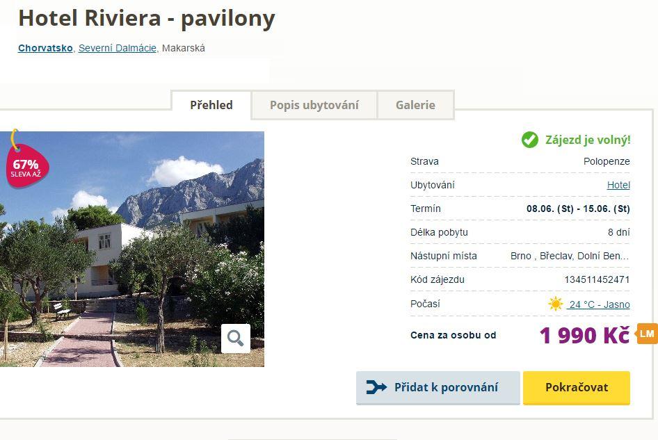 Pokud ovšem trochu slevíme z našich nároků a spokojíme se s autobusovou dopravou lze dnes zakoupit autobusový zájezd do Chorvatska za 1 990 Kč! Tento zájezd na 8 dní v ceně zahrnuje ubytování v hotelu Riviera s polopenzí. Luxusní autobus má kromě klimatizace i bar se studenými a teplými nápoji – nejedná se o žádnou starou Karosu. Snídaně jsou klasicky formou bufetu a k večeři si vyberete jedno jídlo z menu.