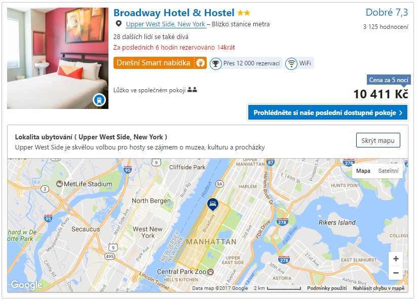 Ačkoliv nejlevnější ubytování v New Yorku začínají na ceně 7.500 Kč za pokoje pro dvě osoby, jedná se o ty nejhorší ubytování. Osobně bych volil spíše nějaký hotel jako je 2★Broadway Hotel ve východní části Manhattanu. Za 5 nocí pro dvě osoby zaplatíte 10.411 Kč. Hodnocení hotelu 7,3/10 b. a zrušení rezervace zdarma se zdá být zlatou střední cestou mezi kvalitou a cenou.