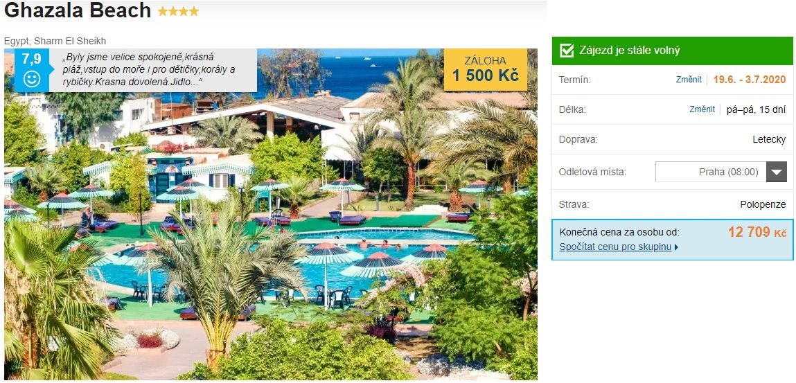 Extrémně dlouhý pobyt na 15 dní v hotelu v letovisku Sharm El Sheikh aktuálně stojí 12.709 Kč, zvolit si přitom můžete jak přímý let z Prahy, tak i Bratislavy. Čythvězdičkový hotel Ghazala je navíc slušně hodnocený a dle videa viz níže vypadá lákavě interiér i zahrady kolem hlavní budovy. Potápění je možné nedaleko pobřeží a nabízí zajímavý podmořský svět viz video, jde o oblíbenou lokalitu milovníkům potápění. Nachází se ihned u pláže Naama Bay. Hotel umožňuje pozdní check-out.