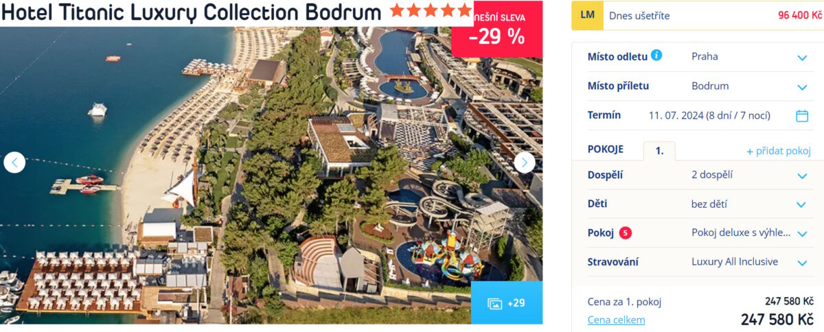 Ojeté auto nebo týden u moře? Pokud máte přebytečný čtvrt milionu korun – můžete se podívat do tureckého 5* hotelu Titanic Luxury Collection Bodrum.