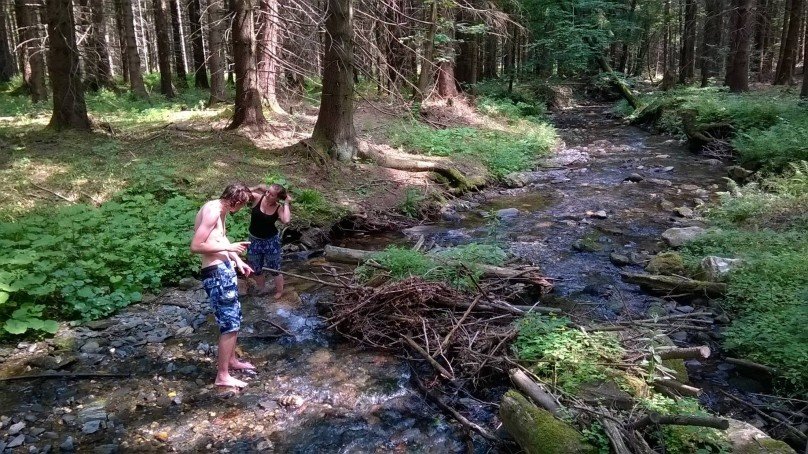 Voda sice měla tak -50 °C (čti plus deset), ale to nás neodradilo. Když člověk překousne prvotní štípání nohou z té ledovky, dá se tam chvíli vydržet. Ještě šťastnější jsme šlapali dál. Po chvíli jsme ale museli nasadit zpátečku, protože jsme zjistili, že jdeme špatným směrem. Došli jsme opět nečekaně k restauraci Hvězda. Protentokrát jsme se zastavili i na oběd. Žebírka, pizza, česnečka, zalít to pivem a hurá na Ovčárnu.