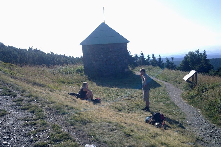 Turisté se začali objevovat zpoza každého rohu/stromu. Batohy jsme nechali pod skálami, však ty naše náklady by nikdo tahat nechtěl. Naše důvěra v horskou poctivost nás nezklamala. Cesta dolů byla už pro všechny krásný odpočinek. Po pár kilometrech jsme dorazili do vytoužené hospůdky Na Skřítku. Kluci si totiž nevzali žádnou láhev na vodu a moje 1,5 l bandaska pro tři opravdu v těch vedrech nestačí. Naše jediná naděje – potůček – byl bohužel vyschlý. Žízniví, unavení a hladoví jsme si dali konečně pivečko a oběd. Do cíle zbývalo necelých 18 km.