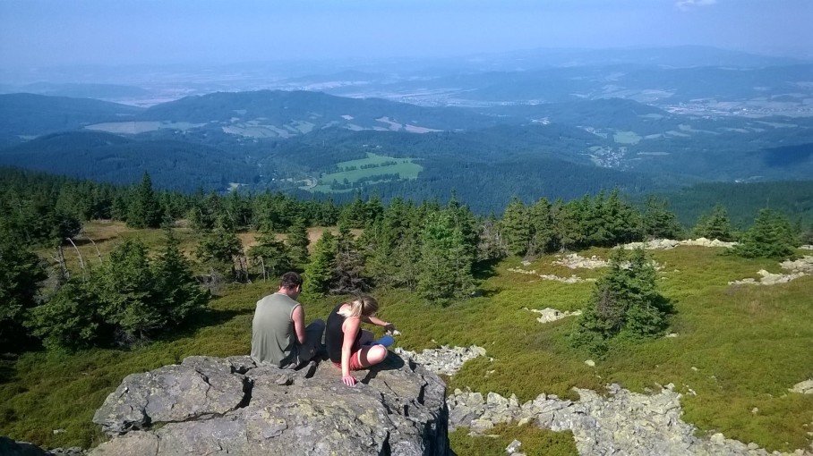 Ukázal se nám celý Praděd, Mravenečník, údolí řek Bílá Opava a Desná a nezapomenutelný pohled na tu krásu přírody. Stano, jakožto Tatranský rodák, viděl bouřkový mrak a začal nás trochu popohánět. Začal být lehce paranoidní, že nás stihne po cestě bouřka a v téhle lokalitě to není nejpříjemnější věc. Nemohla jsem jít rychleji než slimáčí rychlostí (alespoň v botách), a tak jsem vzala botky do rukou a šla po travnaté peřince bosky.