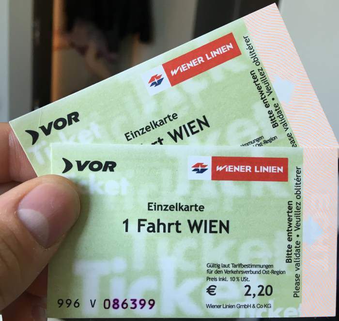 Druhy jízdenek jsou velice podobné, jako u nás, a platí pro celou síť vídeňské MHD. Zakoupit si tak můžete např. jednorázový lístek (nepřestupní) za 2.20€, či lístek s trváním 24 hodin za 7.60€, případně celotýdenní lístek za 16.20€. Časově omezených lístků je však celá spousta a tak není nic jednoduššího, než si vybrat ten, který vám bude nejvíce vyhovovat.