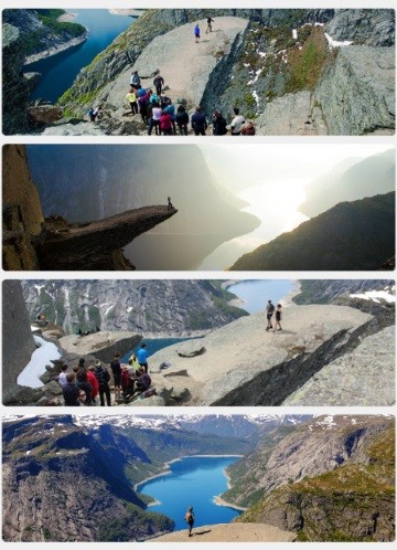 Každý správný dobrodruh rád využije příležitost podniknout minimálně čtyřhodinovou túru (jen cesta tam), na jejímž konci může „ulovit“ snímek svých nohou, houpajících se nad okrajem 700-metrového srázu nad jezerem Ringedalsvatnet ( 1100 m.n.m.). Navíc se tady rozhodně netoulají davy turistů, protože jde o trasu pro jedince s opravdu dobrou fyzickou kondicí a štěstím na počasí v letních měsících.“