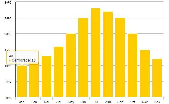 | Průměrné °C | 7 | 7 | 9 | 14 | 18 | 24 | 26 | 28 | 26 | 20 | 12 | 9 |
