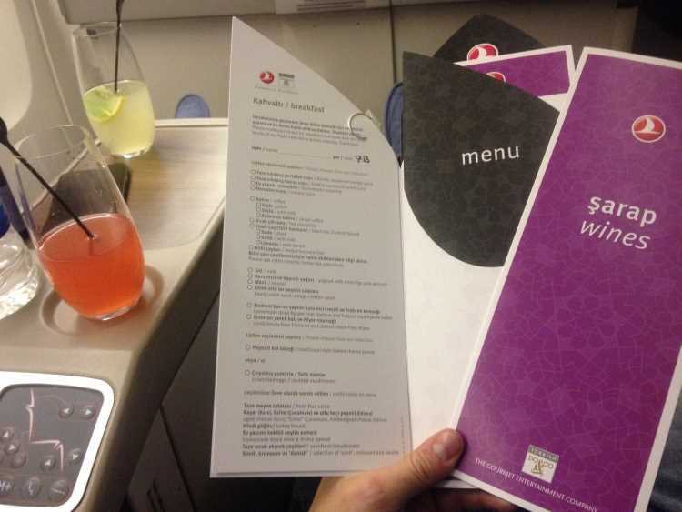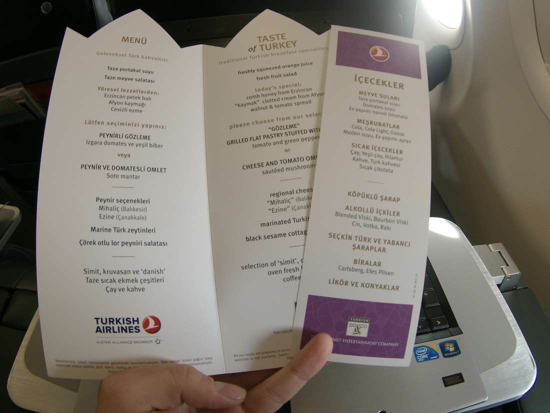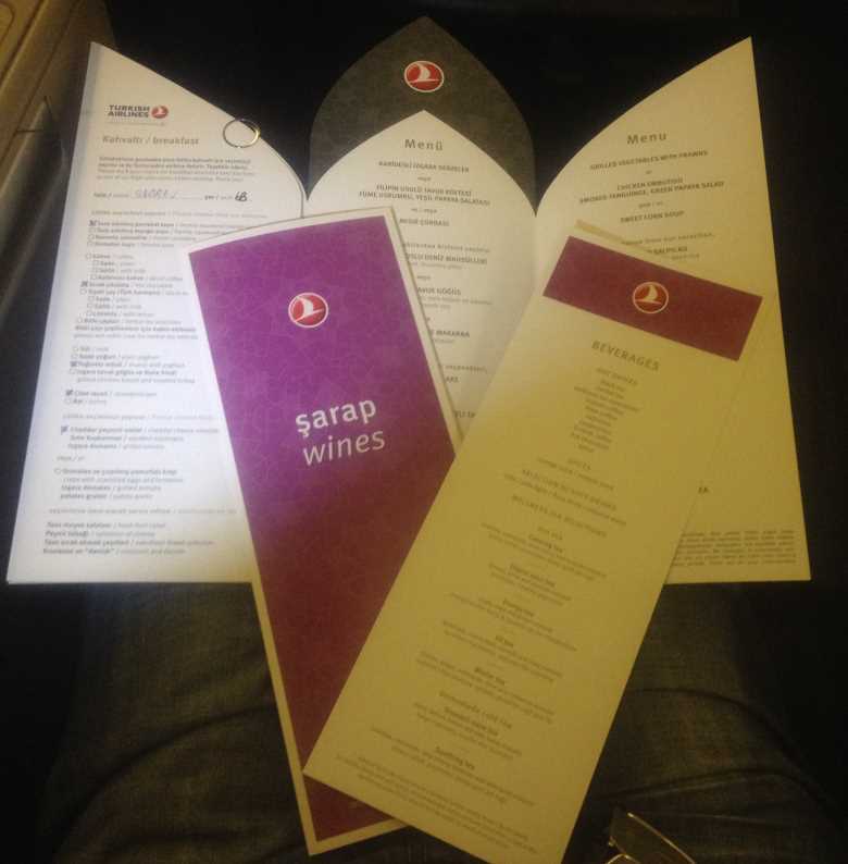 - Malý jídelní lístek na letu Praha – Istanbul (v pozadí welcome drink)