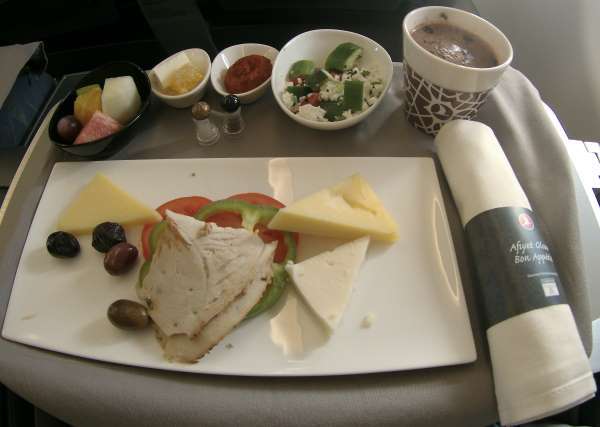 Před vzletem z Prahy do Istanbulu dostanu welcome drink dle výběru a hovím si v přední části letadla ve skvěle polohovatelném sedadlu. Po vzletu dostanu horký hadřík na omytí rukou a vyberu si z jídelního menu hlavní chod opravdu výborné jídlo na „porcelánu“ viz fotogalerie.