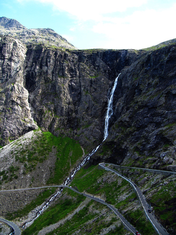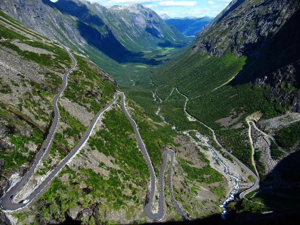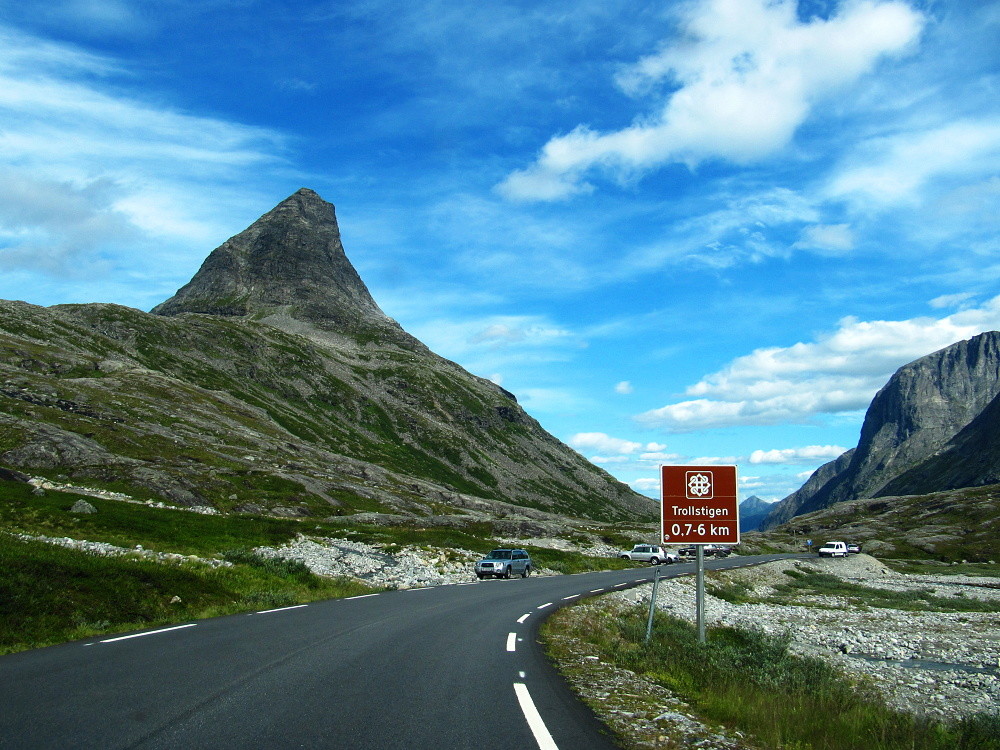Trolí stezka dostala jméno podle bájných severských skřítků – trolů. Nadmořská výška v nejvyšším bodě je pouhých 852 metrů. Silnice se ale zvedá přímo od moře, tvoří ji 11 pověstných zatáček a vede nádhernou norskou krajinou, např. kolem 180 metrů vysokého vodopádu, takže podívaná je to opravdu působivá.