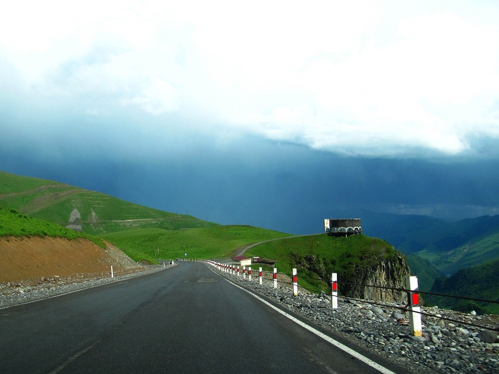 Gruzínská vojenská cesta. Gruzínská vojenská cesta je dlouhá 213 km, překonává hlavní hřeben pohoří Velký Kavkaz, a spojuje tak Evropu s Asií. Stoupá až do Křížového průsmyku do výšky 2384 metrů nad mořem. Překvapí vás mohutností hor a okouzlí nádhernými zelenými loukami, tisícihlavými stády pasoucích se ovcí a pohledy na pětitisícové vrcholy Velkého Kavkazu. Pro nás je to určitě jedno z nejhezčích míst, které jsme kdy viděli.