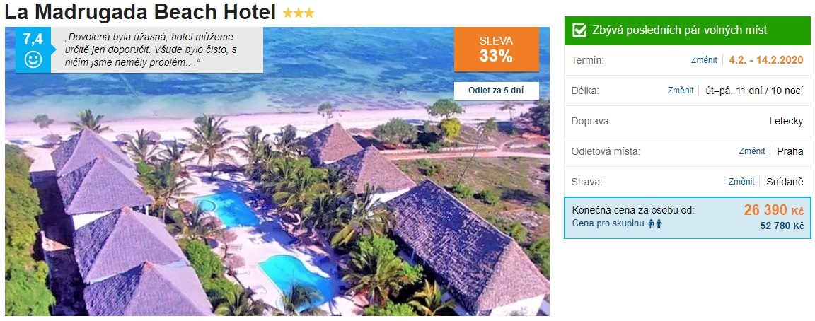 Hned 2 dlouhé zájezdy na 11 dní s odletem z Prahy na Zanzibar můžete dnes pořídit v last minute výprodeji. Prvním je levnější 3★ La Madrugada Beach hotel s hodnocením 7,4/10 bodů a se snídaní za konečných 26.390 Kč na osobu. Tím druhým – lákavějším – je pak 5★ Dreams Bay Boutique hotel s nadstandardním hodnocením 9,2/10 bodů a včetně polopenze za 32.190 Kč. Pokud nemusíte řešit rozdíl 6 tisíc v ceně není co řešit a doporučuji 5★. Pokud hledáte exotiku za nejnižší možný peníze volte 3★.